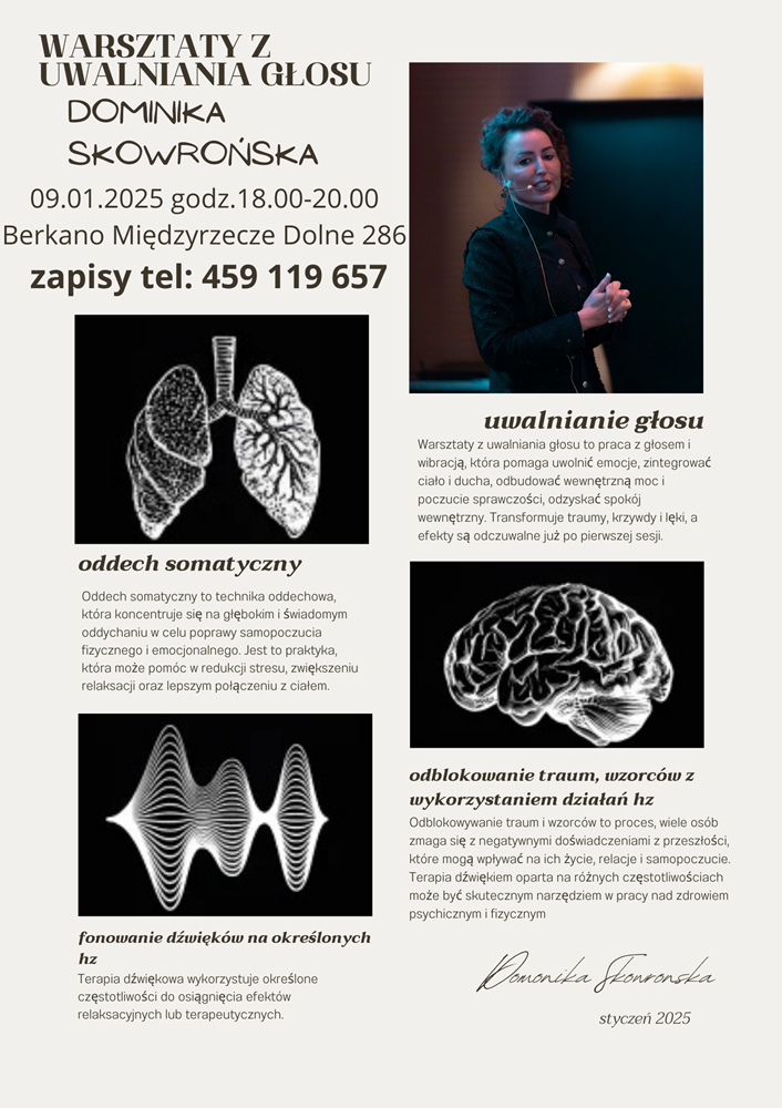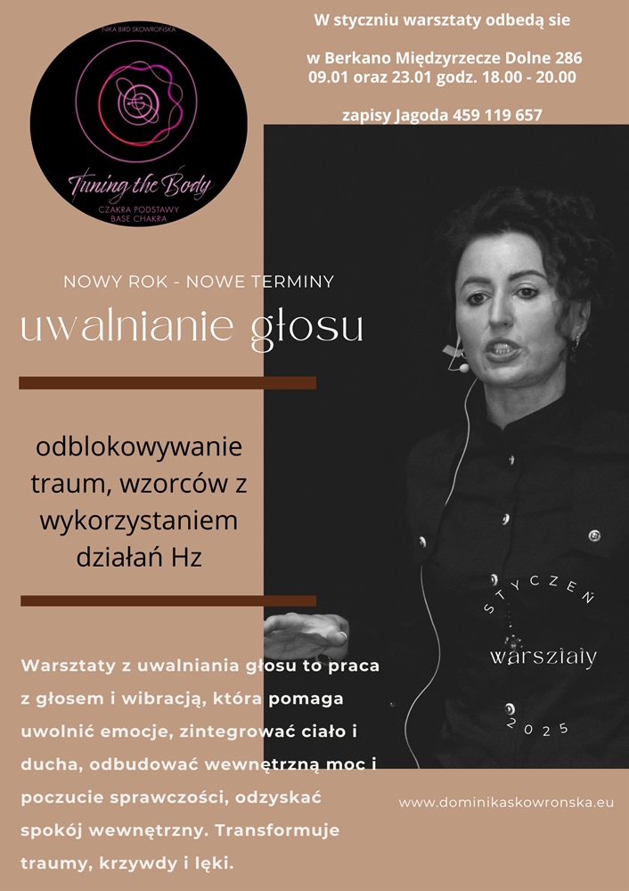 Warsztaty z uwalniania siebie za pomocą swojego głosu to praca z głosem i wibracją, która pomaga uwolnić emocje, zintegrować ciało i ducha, odbudować wewnętrzną moc i poczucie sprawczości, odzyskać spokój wewnętrzny. Transformuje traumy, krzywdy i lęki.